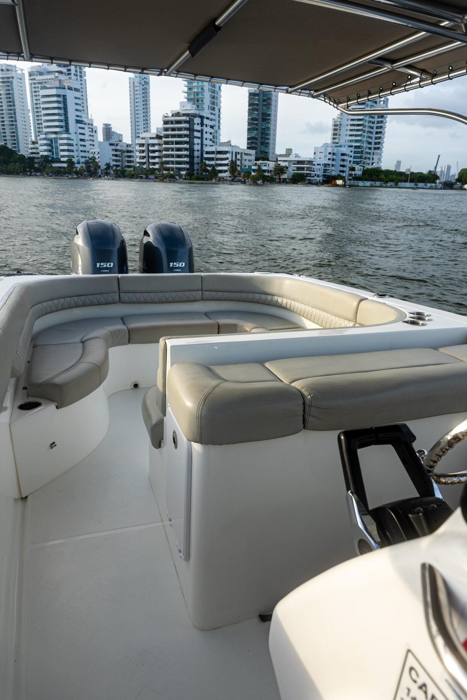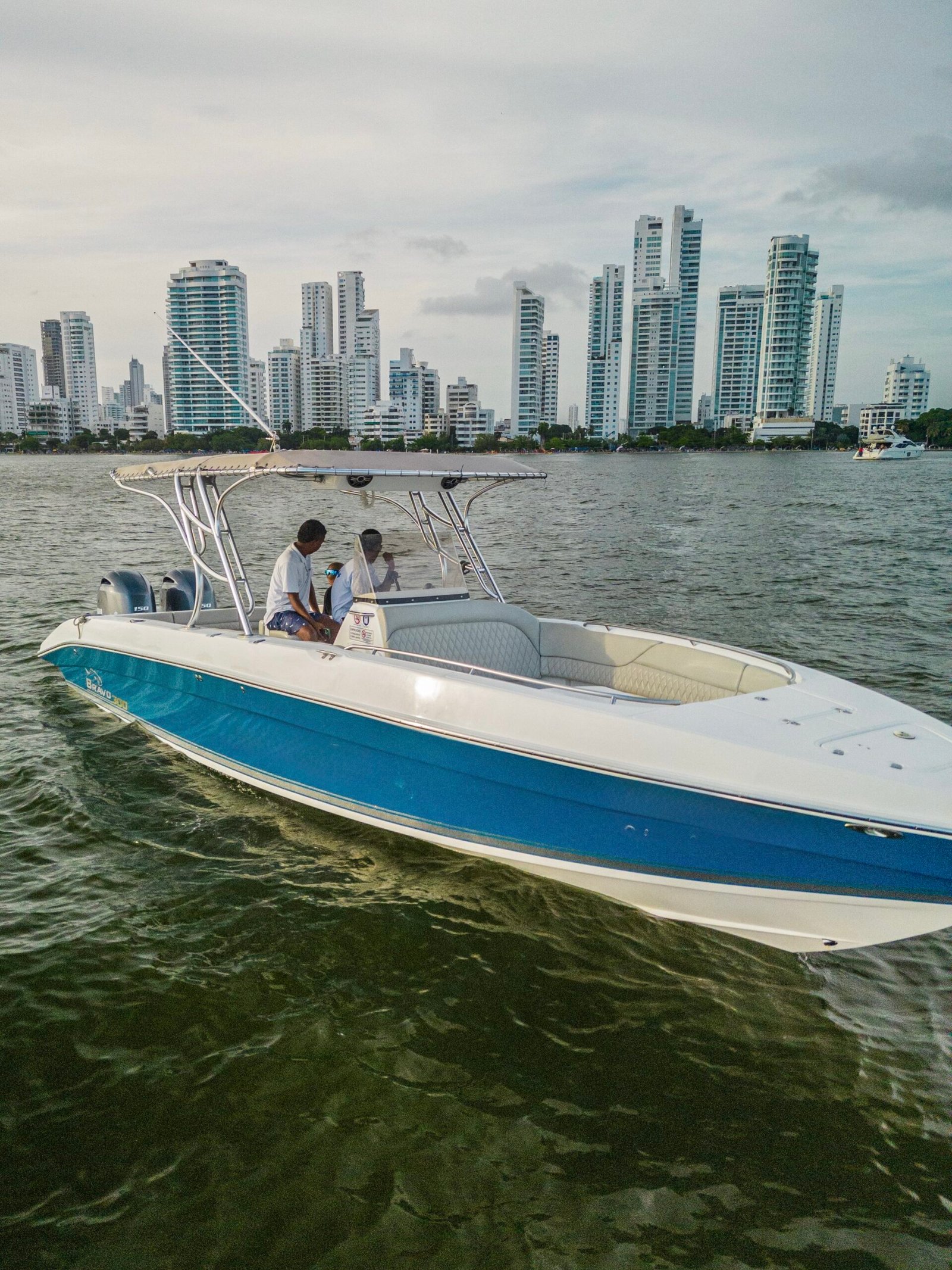 Equipped with two 150 HP Yamaha engines, it guarantees a smooth, fast, and safe ride, ideal for exploring the Caribbean waters with complete confidence. Its JL Premium sound system creates the perfect atmosphere with high-quality music throughout the trip, while its onboard wine cellar keeps your drinks cold so you can enjoy every moment under the sun.